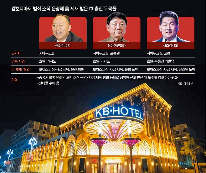 쉬아이민과 함께 미 정부 제재를 받은 둥러청(董樂成·57)도 시아누크빌에 주식회사를 설립해놓고 사업가를 자처하고 있다. 그러나 실제로는 호텔 내부에 범죄 조직 아지트를 꾸리고 보이스피싱 등 사이버 범행을 벌이는 것으로 나타났다. 호텔에 있는 카지노에선 보이스피싱 범죄 수익금을 세탁하고 있다고 미 정부는 밝혔다. 미 국무부는 “둥러청의 호텔에서는 인신매매도 이뤄지고 있다”고 했다. 감금 피해자들이 다른 범죄 조직으로 팔려나가기도 한다는 것이다.