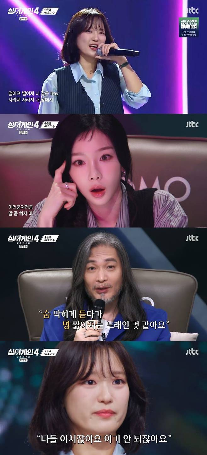 "정말 잘하신다"고 운을 뗀 김이나는 "2011년 이때가 숨듣명 곡들이 많이 탄생하는 시기였다. 후크송, 중독성 강한 노래들이 굉장히 많았다. 동시에 MR 제거가 유행하던 때라 파워풀한 보컬들이 이런 중독성 강한 노래로 활동하는 경우가 많았다. 그래서 '그 시절 걸그룹이면 노래를 잘하겠지' 했는데 혼자 노래하고, 랩하고, 음역대가 왔다갔다한다. 힘든 표정 없이 춤까지 추는 모습을 보면서 '그 시대 찐고수들이 이렇게 많았다'는 것을 다시 느꼈다. 증명해 줘서 감사하다"고 평가해 67호 가수를 눈물짓게 했다.