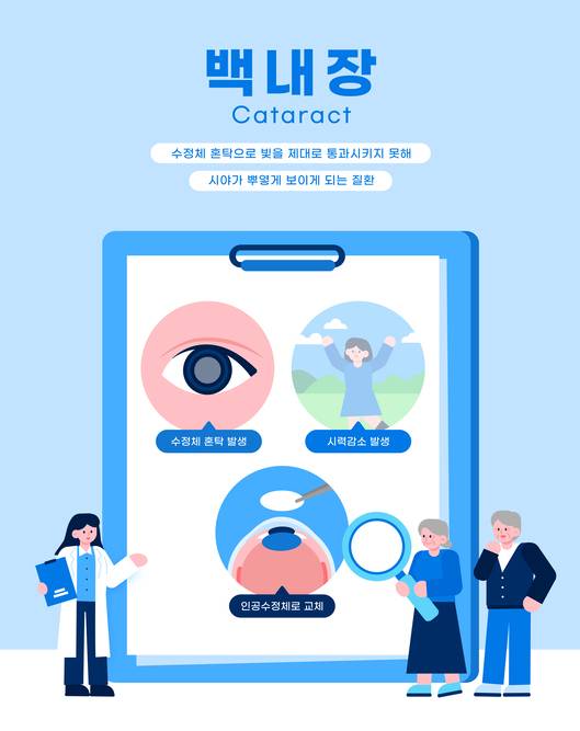 눈이 침침하고 뭔가 낀 것처럼 뿌옇게 보인다면 '백내장'을 의심해야 한다. 백내장은 눈 속 수정체가 혼탁해지면서 물체가 뿌옇게 보이는 질환으로, 대표적인 노인성 질환이다. 흔히 백내장 환자는 "휴대전화 사진첩 속 가족 얼굴이 겹쳐 보인다", "가로등 불빛이 안개처럼 번져 눈을 찌른다"는 식으로 불편감을 호소한다.