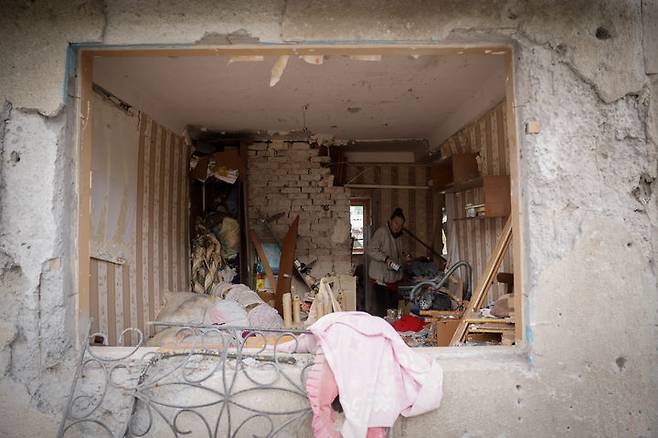 [코스탄티니우카=AP/뉴시스] 우크라이나 제24기계화여단 공보단이 13일(현지 시간) 공개한 사진에 도네츠크주 최전선 마을 코스탄티니우카의 한 주민이 러시아의 폭격으로 파손된 자신의 아파트 안에서 생활하고 있다. 러시아군과 격전지인 이곳에는 약 5000명의 주민이 물·전기·가스 공급이 끊긴 채 머물고 있다. 2025.10.15.