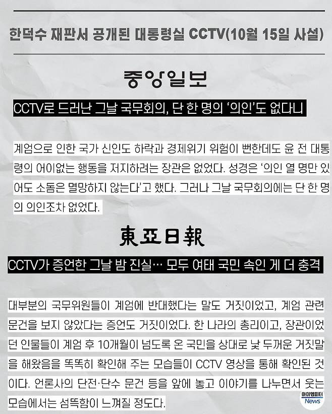 <동아일보>는 "CCTV가 증언한 그날 밤 진실… 모두 여태 국민 속인 게 더 충격"이라며 "대부분의 국무위원들이 계엄에 반대했다는 말도 거짓이었고, 계엄 관련 문건을 보지 않았다는 증언도 거짓이었다"고 질타했습니다.