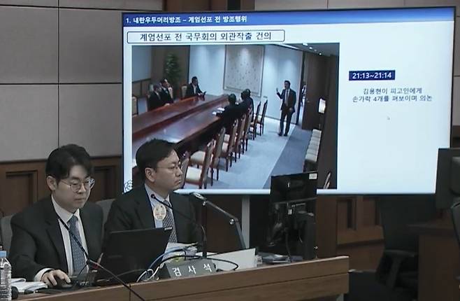 | ▲ 13일 서울중앙지방법원 형사합의33부(재판장 이진관 부장판사) 심리로 진행된 한덕수 전 국무총리 내란 우두머리 방조 사건 2차 공판에서 비상계엄 선포 당일 대통령실 CCTV에 대한 증거조사가 이뤄지고 있다. |