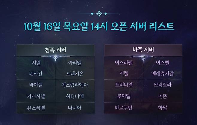 엔씨소프트는 이번 이벤트와 함께 '천족'과 '마족'으로 나뉜 두 진영의 서버 리스트도 공개했다. 각 진영에는 '트리니엘', '카이시넬', '마르쿠탄', '아스펠' 등 다양한 서버가 준비돼 있으며 이용자들은 자신이 원하는 진영과 서버를 선택해 사전에 준비할 수 있다.