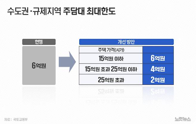 현행 6억 원인 수도권과 규제 지역 내 주택담보대출(주담대) 한도를 주택 가격 수준에 따라 차등을 두기로 했다. 25억 원을 초과하는 주택은 대출 한도가 2억 원으로 조정된다. 15억 원을 초과하고 25억 원 이하인 주택은 4억 원, 15억 원 이하는 현행 6억 원을 유지하는 방안이다. 대출 문턱을 낮추는 한도 차등 적용은 오는 16일부터 바로 시행된다.