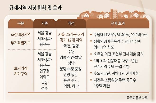 기존에는 강남3구(강남·서초·송파구) 및 용산구만 해당됐던 규제지역이 집값 과열 양상을 주도했던 경기도 주요 지역과 서울 전체로 확대되면서 이들 지역은 주택 매입 시 ▷대출 ▷세제 ▷전매 ▷청약 ▷정비사업 등 여러 분야에서 제약이 커질 전망이다.