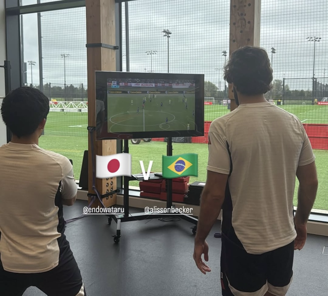 흥미로운 순간이 있었다. 바로 영국에서 나란히 경기를 지켜보던 엔도와 알리송의 장면이었다. 두 선수는 각각 일본, 브라질 대표팀의 ‘핵심 선수’다. 다만 10월 A매치를 앞두고 나란히 부상을 당하며 합류하지 못했다. 이에 두 선수는 함께 재활 훈련에 임했는데, 일본과 브라질의 경기를 함께 시청했다.