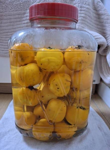 | ▲ 소금물로 감 우리기 소금과 물을 1대5의 비율로 섞어 한 번 끓인 후 50~60도 정도로 식혀 유리병에 붓고 이불을 덮어두면 이틀 정도 후 월하감이 우려집니다. |