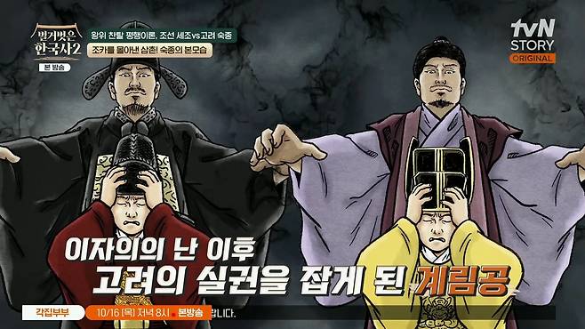 10월 14일 방송된 tvN STORY <벌거벗은 한국사2>에서는 '왕위찬탈 평행이론, 조선 세조 VS 고려 숙종'편을 다뤘다.