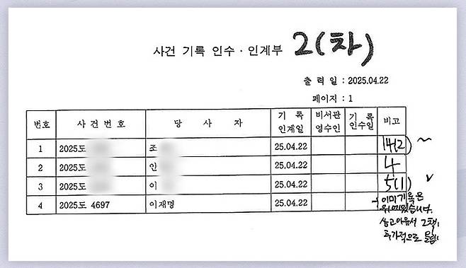 여기서 눈에 띄는 점은 4월 22일에 사건 기록이 인계된 총 4건의 사건 중, 유독 '이 대통령 사건'에만 "이미 기록은 위에 있습니다"라는 손 글씨가 덧대져 있다는 겁니다. 왜 '이 대통령 사건'에만 손 글씨를 적어놨을까요? 이미 위로(?) 올렸다고 쓴 이유는 뭘까요? 이에 대한 대법원의 공식 입장은 문건 어디에도 남아있지 않습니다.