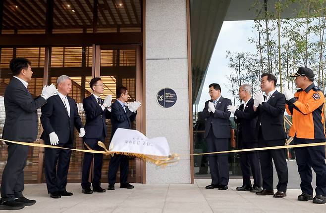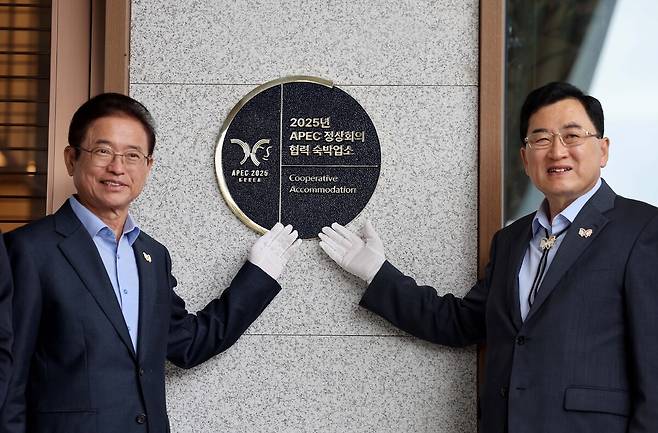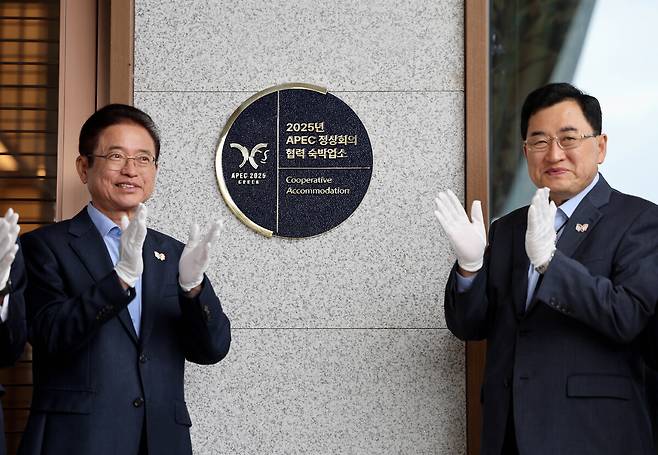 APEC 정상회의를 보름 앞둔 15일 이철우 경북도지사와 주낙영 경주시장을 비롯한 실무진이 경주 보문관광단지 일원에서 준비 상황 현장 점검을 시행했다. 소노캄 경주 호텔에서 협력 숙박업소 인증현판 제막식을 하고 있다. /이용선기자 photokid@kbmaeil.com