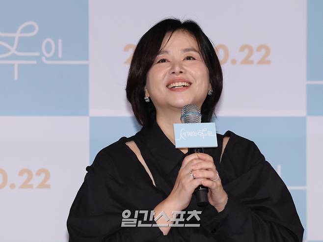 배우 장혜진이 15일 오후 서울 용산구 CGV용산아이파크몰에서 열린 영화 '세계의 주인' 언론배급시사회 및 기자간담회에 참석해 인사말을 하고 있다.