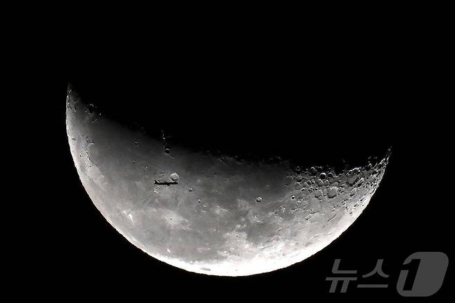 (쿠웨이트시티 AFP=뉴스1) 권영미 기자 = 15일 새벽, 쿠웨이트시 상공에서 떠오르는 달 옆으로 한 대의 민간 항공기가 지나가고 있다. 지구 대기권 내에서 비행하는 항공기가 달 바로 앞을 지나는 것처럼 찍힌 것은 카메라의 망원 렌즈와 원근법 효과 때문이다. 2025.10.15.