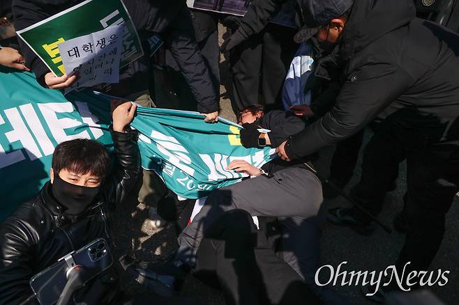 | ▲ 2월 26일 오전 서울 서대문구 이화여대에서 ’윤석열 대통령 탄핵을 반대하는 이화인’ 주최 탄핵반대 시국선언이 열린 가운데, ‘이화여대 긴급행동을 준비하는 재학생 졸업생’들이 쿠데타 옹호를 규탄하는 항의시위를 벌였다. 이 과정에서 안정권 벨라도 대표, 배인규 신남성연대 대표 등 윤석열 지지자들이 시국선언 참가자들을 보호하겠다며 교내에 들어와 쿠데타 옹호 규탄 시위 참가자들앞에 드러누워 방해하고 있다. |