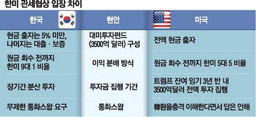 김 실장 등 한국 고위급 협상팀이 방미길에 들고 가는 MOU 2차 수정안에는 3500억달러 규모 대미투자펀드 조성 및 이익 분배 방식과 무제한 한미 통화스왑 체결 등 한미가 첨예한 입장 차이를 보여온 현안에 대한 보다 현실적인 대안이 반영됐을 것으로 보인다. 양국의 입장 차이를 조금씩 좁혀가는 과정에서 일정 수준의 접점을 제시하려는 것이다.