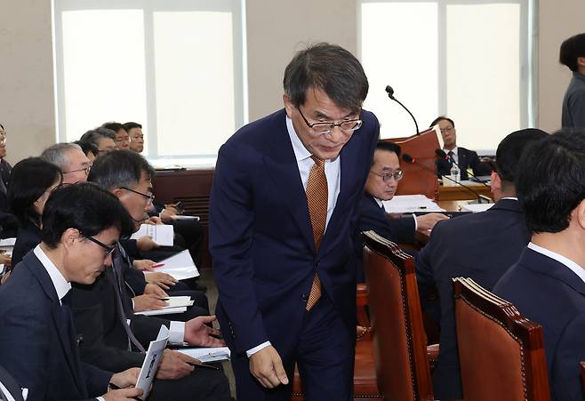 | 인사말 후 퇴장 노태악 중앙선거관리위원장이 15일 서울 여의도 국회에서 열린 행정안전위원회의 중앙선관위, 인사혁신처 등에 대한 국정감사에서 인사말을 마친 뒤 이석하고 있다. 연합뉴스 |