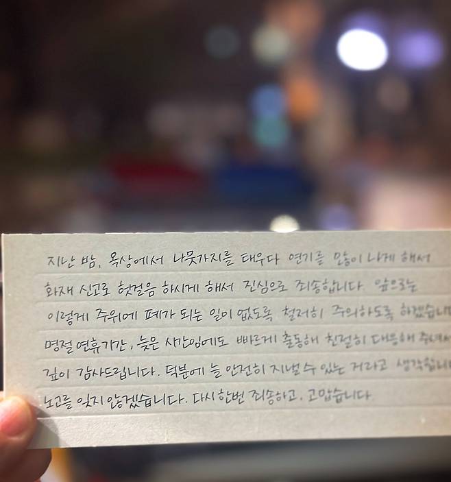 "지난 밤, 옥상에서 나뭇가지를 태우다 연기가 많이 나게 해서 화재 신고로 헛걸음하시게 해서 진심으로 죄송합니다. 앞으로는 이렇게 주위에 폐가 되는 일이 없도록 철저히 주의하도록 하겠습니다. 명절 연휴 기간, 늦은 시간임에도 빠르게 출동해 친절히 대응해 주셔서 깊이 감사드립니다. 덕분에 늘 안전히 지낼 수 있는 거라고 생각합니다. 노고를 잊지 않겠습니다. 다시 한번 죄송하고, 고맙습니다"