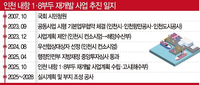 18년 만에 본격화한 내항 1·8부두 재개발 사업의 출발점은 2007년으로 거슬러 올라간다. 당시 국회 시민청원으로 사업이 첫발을 뗐으나 사업성 부족으로 수년간 난항을 겪었다.