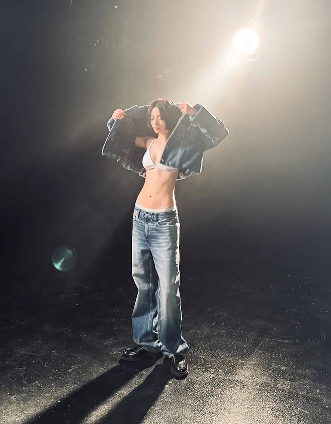 나나는 심플한 흰색 캘빈클라인 언더웨어 세트에 다양한 아우터를 매치하며 팔색조 같은 매력을 뽐냈다.