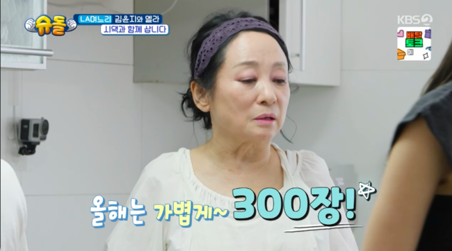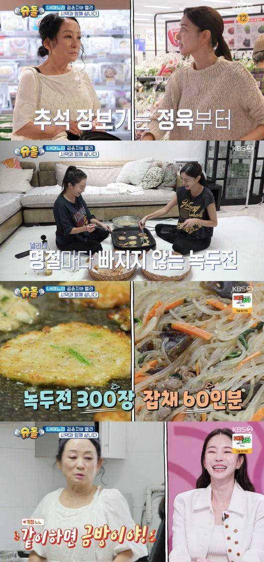김윤지는 이상해에 엘라를 맡긴 후 김영임, 시누이와 함께 요리를 시작했다. 그런 가운데 김영임은 녹두전 반죽 5대접은 물론, 순식간에 잡채 60인분을 완성했다.