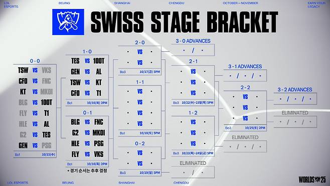 [롤드컵] 1승씩 거둔 LCK 젠지-T1-KT, 스위스 스테이지 2라운드에서 내전 피했다