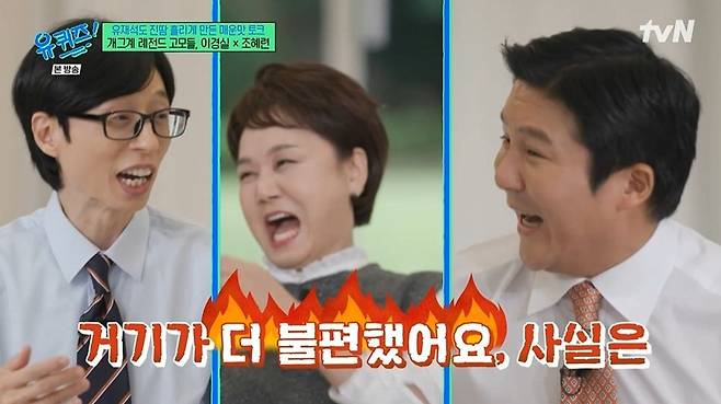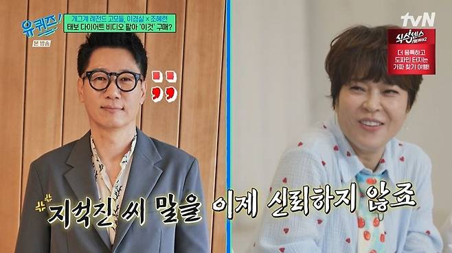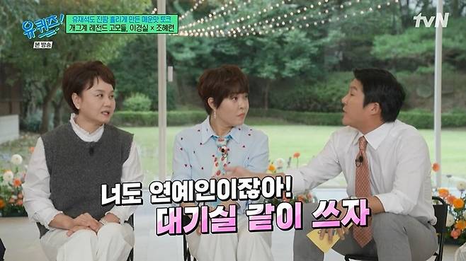 이날 이경실, 조혜련은 '유퀴즈' 섭외를 기다렸다고 고백했다. 조혜련은 "전화 왔을 때 단독인 줄 알았는데, 이경실 씨가 붙어있더라"면서 아쉬워했고, 이경실은 "미안하다. 난 혜련이랑 나간다고 해서 더 좋았다"라고 밝혔다. 조혜련은 "그럼 내가 뭐가 되냐"라고 머쓱해하기도.