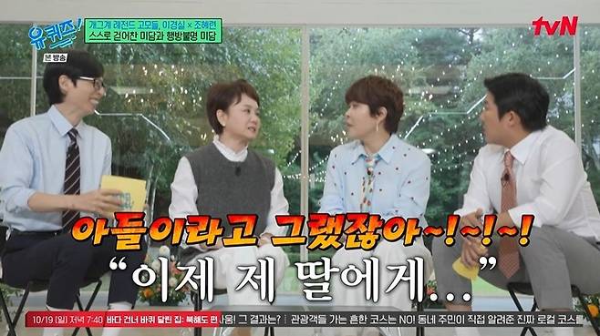 이경실은 아들 손보승을 위해 조혜련이 돈을 보내준 일화를 언급했다. 이경실은 "어느 날 혜련이가 방송을 보고 '보승이가 그렇게 어렵게 사는 줄 몰랐어. 동생 생각나서 그래'라면서 50만 원을 보내줬다"라고 밝혔다. 이를 전해 받은 손보승은 조혜련에게 "이제 제 딸에게 '빠나나날라'와 '아나까나'만 들려주겠다"고 했다고. 그러나 이경실은 "아들이야. 그때도 아들이라고 몇 번을 얘기했는데"라고 울컥하며 "다 좋은데 남의 말을 귀담아듣지 않아"라고 토로해 웃음을 자아냈다.