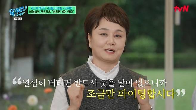 이어 이경실은 "자신 있게 얘기합니다만, 전 나름대로 참 열심히 살았다. 저도 포기하고 싶을 때가 있었는데, 그걸 견뎌내니까 또 웃을 일이 있더라. 너무 젊은 친구들이 포기할 때 그때 정말 가슴이 아프다. 그 순간만 넘기고, 조금만 버티면 반드시 웃을 날이 있다"라고 진심이 담긴 조언을 했다.