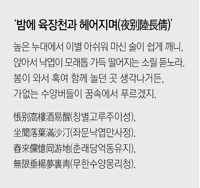 영화 속 프랭크가 후각을 활용해 보이지 않는 세상을 파악했다면, 시인은 오로지 기억에 의지해 자신만의 문학 세계를 만들어 갔다. 시인은 형들이 시 낭독하는 소리를 듣고 암송해서 공부했다고 하는데(陳衎, ‘唐仲言·李公起’), 각고의 노력 끝에 당시(唐詩)에 대한 탁월한 해설서인 ‘당시해(唐詩解)’를 쓰기도 했다. 동시대 유명 문인이었던 종성(鍾惺)은 시인을 만나 본 뒤 글자의 형태조차 알지 못하는데도 해박한 주석을 작성한 것에 대해 경탄했다(‘贈唐仲言序’). 이수광이나 이규경 같은 조선 문인들도 ‘당시해’의 저자가 시각장애인이란 사실에 깊은 감명을 받았다.