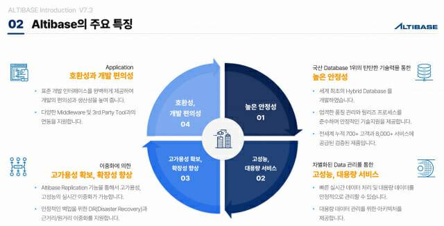 대용량 데이터 처리가 가능하다. 최신 버전은 'ALTIBASE V7.3'이다. 클라우드 환경에서 성능을 더욱 강화했다. 특히 'ALTIBASE V7.3'은 글로벌 금융 및 통신 기업들의 미션 크리티컬 시스템에 잇달아 공급, 국산 DBMS의 글로벌 경쟁력을 입증한 제품이기도하다."
