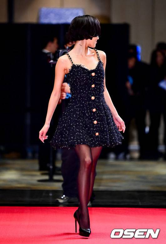 이날 화사는 골드 단추 장식이 돋보이는 블랙 트위드 미니 원피스에 블랙 스타킹과 킬힐을 매치해 특유의 세련된 분위기를 자아냈다. 다이어트로 더욱 가늘어진 팔과 다리, 뚜렷한 쇄골 라인이 ‘뼈말라’ 그 자체였다.