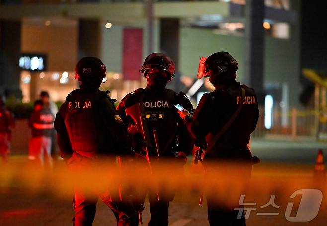 (과야킬 로이터=뉴스1) 윤다정 기자 = 14일(현지시간) 에콰도르 과야킬의 한 쇼핑몰 밖에서 차량이 폭발한 현장에서 경찰관들이 경계를 서고 있다. 2025.10.14.