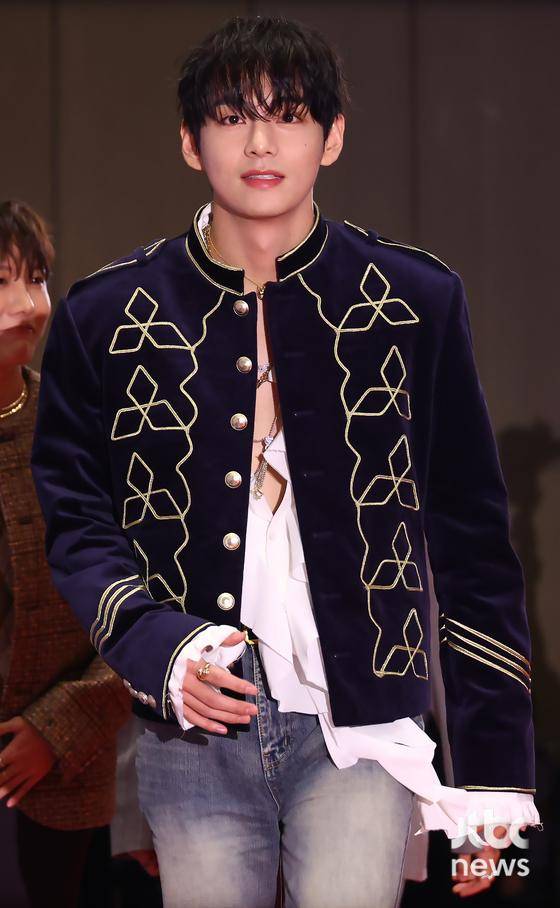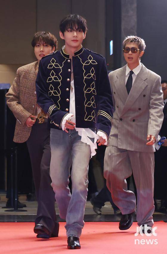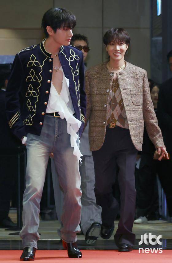 RM은 그레이 톤의 더블 수트와 선글라스로 세련된 무드를, 제이홉은 클래식한 패턴 재킷과 여유로운 미소로 밝은 에너지를 전했다. 뷔는 네이비 벨벳 재킷과 데님을 매치해 독보적인 스타일을 완성하며 포토월의 시선을 단숨에 사로잡았다.