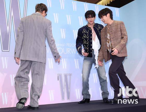 세 사람은 나란히 서서 하트 포즈를 취하며 행사 취지에 공감하는 따뜻한 메시지를 전했다. 갑작스러운 등장에도 유쾌한 미소와 여유로운 제스처로 현장을 훈훈하게 물들였다. 특히 뷔는 자신을 상징하는 'V'포즈를 두 손으로 이어 'W'를 만드는 센스로 스포트라이트를 받았다.
