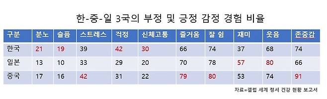 세 나라는 전반적으로 세계 평균에 비해 부정적 감정 경험 비율이 낮았지만 한국은 걱정과 스트레스에서 세계 평균보다 높은 비율을 보이는 등 3국 가운데 부정적 감정 경험이 가장 강하게 나타났다. 한국은 긍정적 경험에서도 3국 중 가장 낮은 비율을 보였다. 5가지 긍정 경험 중 즐거움, 재미, 웃음, 존중감 4가지가 이웃국가는 물론 세계 평균치보다 낮았다.