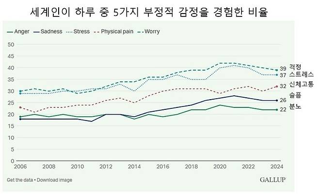 걱정과 스트레스 외에 슬픔(26%), 분노(22%), 신체적 고통(32%)을 경험한 비율도 높게 나왔다. 보고서는 “코로나19 팬데믹 때보다는 낮아졌지만 모든 수치가 10년 전보다 훨씬 높아졌다”고 밝혔다.