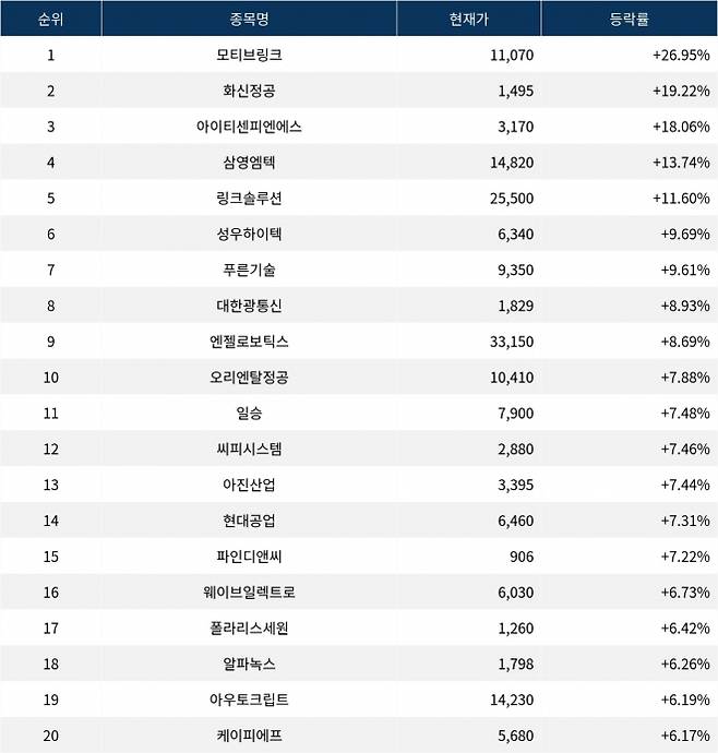 6위 성우하이텍(015750)은 현재가 6,340원으로 9.69% 상승 중이다. 7위 푸른기술(094940)은 현재가 9,350원으로 9.61% 상승 중이다. 8위 대한광통신(010170)은 현재가 1,829원으로 8.93% 상승 중이다. 9위 엔젤로보틱스(455900)는 현재가 33,150원으로 8.69% 상승 중이다. 10위 오리엔탈정공(014940)은 현재가 10,410원으로 7.88% 상승 중이다.