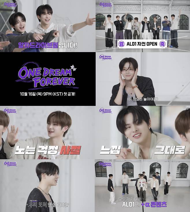 알파드라이브원(준서, 아르노, 리오, 건우, 상원, 씬롱, 안신, 상현)은 15일 공식 유튜브 채널을 통해 첫 자체 콘텐츠 'ONE DREAM FOREVER'의 예고편을 공개했다. 이번 콘텐츠는 16일 오후 9시 처음 공개된다.