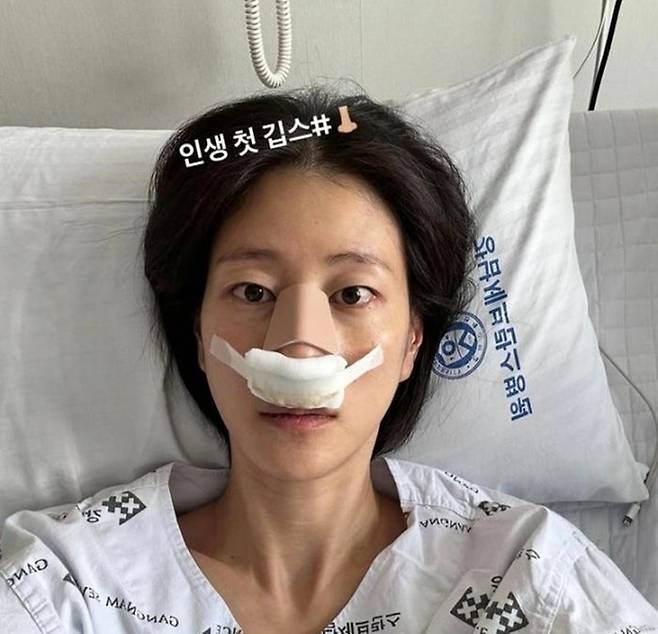 사진 속 이현이는 콧등에 부목과 거즈를 댄 채 병상에 누워 있다.