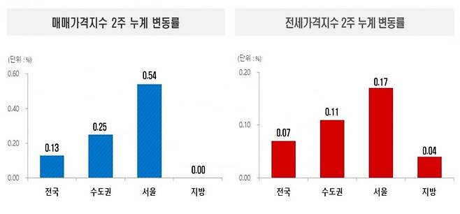 16일 한국부동산원에 따르면 이번주(지난 13일 기준) 서울 아파트 매매가는 2주 전보다 0.54% 상승했다.