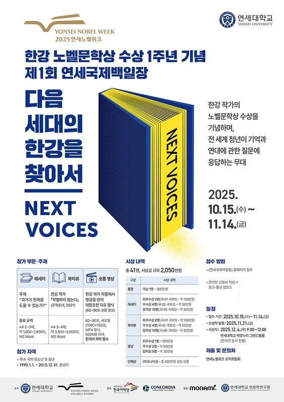 연세대학교는 한강 작가의 노벨문학상 수상 1주년을 기념해 ‘제1회 연세국제백일장: “다음 세대의 한강을 찾아서”’를 진행한다.