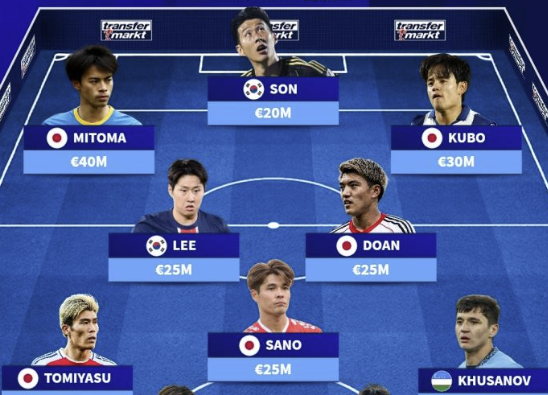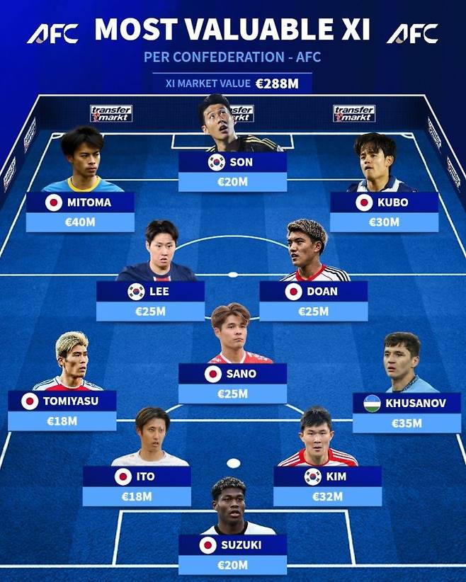 유럽 이적시장 전문 매체 '트란스퍼마르크트'가 16일(한국시간) 공개한 'AFC 몸값 베스트 일레븐(MOST VALUABLE XI)' 명단에 따르면, 일본이 무려 7명의 선수를 배출하며 아시아 내 절대 강세를 다시 한 번 입증했다.