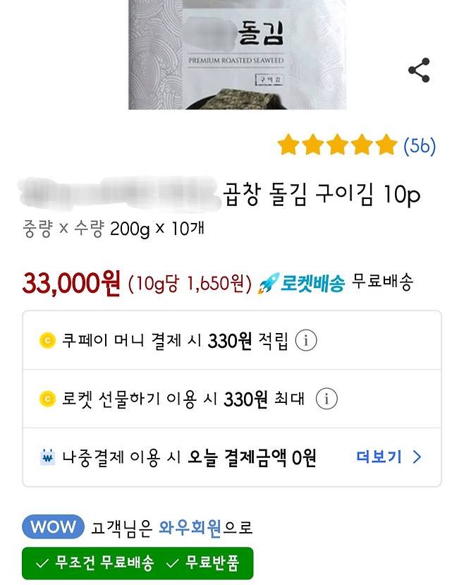 2022년 3월 당시 쿠팡은 이 구이김을 팔면서, 정가를 3만 3천 원으로 표시한 뒤 '와우회원가'로 2만 8천 원을 표시해 뒀습니다.