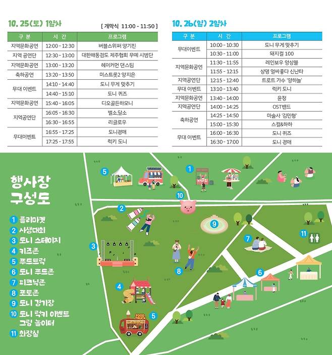 축제 첫째 날은 오전 10시 30분 길트기 공연과 11시 개막식을 시작으로 ▲가수 양지은 축하공연 ▲제주산 돼지고기, 특산물 즉석 경매 ▲도니레이싱 ▲피그컬 100 ▲피그패밀리 콘테스트 ▲금고에 담긴 황금돼지도니 스페셜 이벤트 등이 펼쳐질 예정이다.