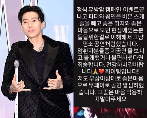 이와 관련해 박재범은 16일 자신의 계정에 “정식 유방암 캠페인 이벤트 끝나고 파티와 공연은 바쁜 스케줄을 빼고, 좋은 취지와 좋은 마음으로 모인 현장에 있는 분들을 위한 걸로 이해해서 그냥 평소 공연처럼 했습니다. 암 환자분들 중 제 공연을 보시고 불쾌했거나 불편하셨다면 죄송합니다”라고 사과했다.
