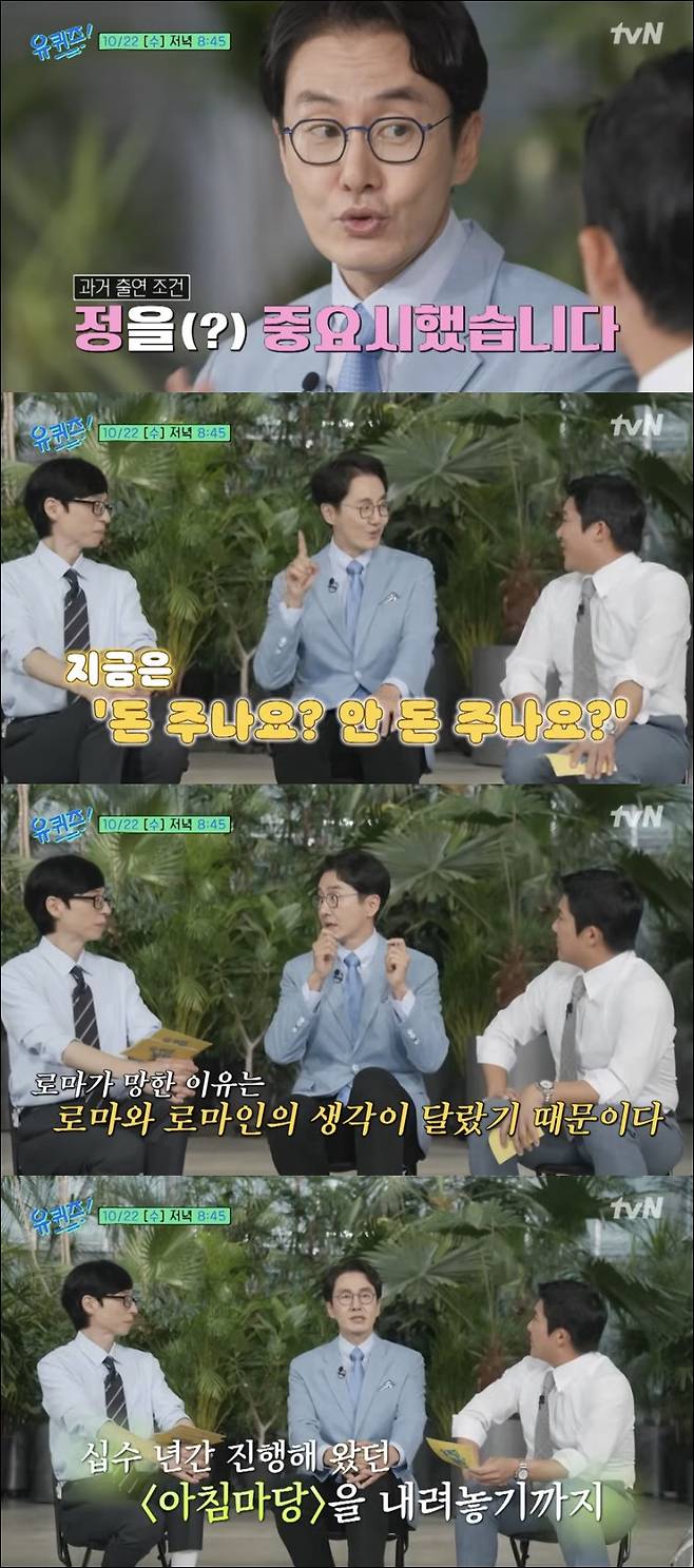 KBS 퇴직 후 프리랜서 방송인이 된 김재원은 방송 출연 조건에 대해 "예전에는 정을 중요시 여겼다. 요즘에는 '돈 주나요. 안 돈 주나요'"라고 솔직히 밝혔다. 이에 유재석은 "조건이 맞으면 간다"고 간략하게 정리했다.