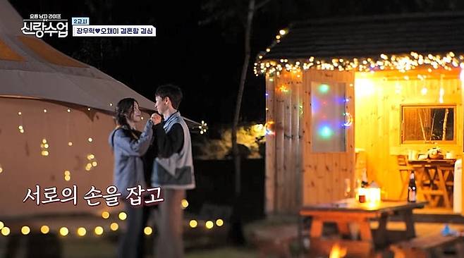 식사 후 두 사람은 모닥불을 피워놓고 낭만에 젖었다. 장우혁은 들국화의 '매일 그대와'를 틀어놓은 뒤 오채이의 손을 잡고 춤을 추기도 했다. 그러면서 그는 "오늘 음식이 맛도 맛인데 채이가 날 생각해주는 느낌을 많이 받았다. 저 노래처럼 매일 이런 음식을 해주는 사람이 있으면 얼마나 좋을까"라고 고백하며 미리 준비해온 '커플 반지'를 내밀었다. 귀여운 비즈 반지에 오채이는 뭉클해했다. 장우혁은 '아기 반지'라며 오채이의 새끼손가락에 작은 반지를 하나 더 끼워줘 '프러포즈'급 이벤트를 선사했다.