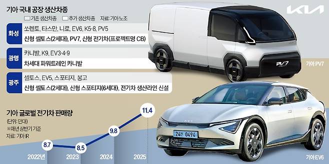 이와 함께 2027년 출시를 앞둔 PV7도 화성의 ‘EVO 플랜트’에서 생산하기로 확정했다. PV7은 현대자동차의 스타리아보다 70㎝가량 긴 중형 목적기반차량(PBV)이다. 화성2·3공장에서 병행 생산하던 준중형 전기 스포츠유틸리티차량(SUV) EV6는 화성3공장에서만 전담 생산하는 것으로 조정했다. 회사 관계자는 “생산 효율을 높이기 위한 조치”라고 설명했다.