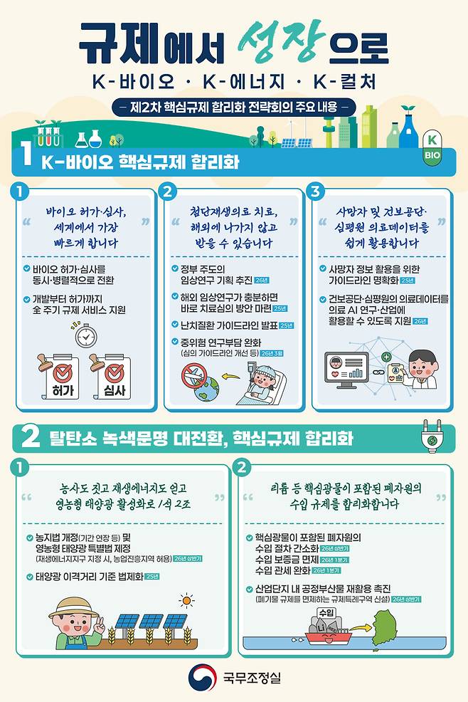 이밖에도 영농형 태양광 활성화를 위해 입지 규제를 완화하고, 핵심 광물 추출을 위한 폐자원 수입 절차 간소화도 이뤄집니다. 영화 제작 지원을 위한 정책 펀드 확대 등 문화 분야 규제 합리화도 추진됩니다.