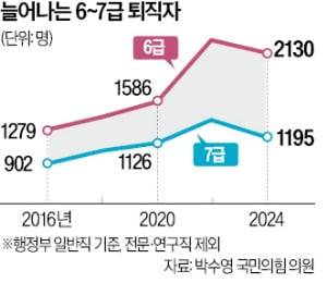 16일 한국경제신문이 박수영 국민의힘 의원으로부터 입수한 자료에 따르면 지난해 행정부 일반직 국가공무원 퇴직자(연구·전문직 등 제외) 6510명 중 6급이 2130명(32.7%), 7급이 1195명(18.4%)으로 집계됐다. 일선 실무를 맡는 6, 7급이 퇴직자의 절반 이상(51.1%)을 차지한 것이다. 2016년 각각 1279명, 902명에 불과하던 6, 7급 퇴직자는 8년 만에 52% 늘어났다.