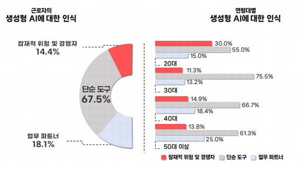 관리자급인 중장년층에게 생성형 AI(인공지능)가 ‘업무 파트너’로 자리잡고 있다. 반면 청년층은 일자리를 위협하는 경쟁자로 받아들였다.